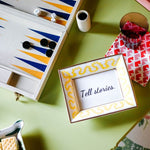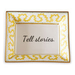 Inspired by the Madcaps's passion for needlepoint pillows, the “Tell Stories” porcelain trinket tray features features yellow vermicelli patterned trim and gilt edging. The perfect host/hostess or holiday gift.