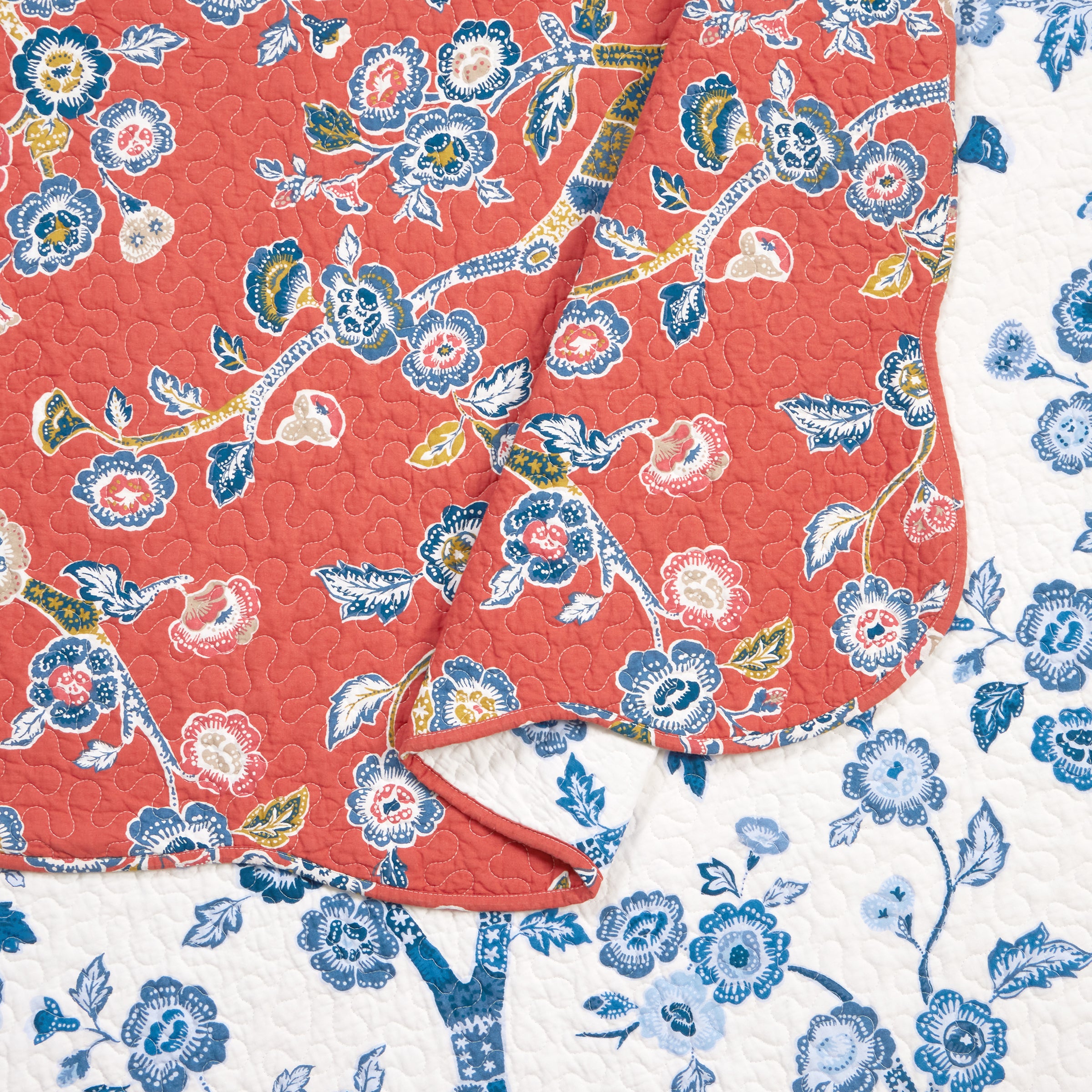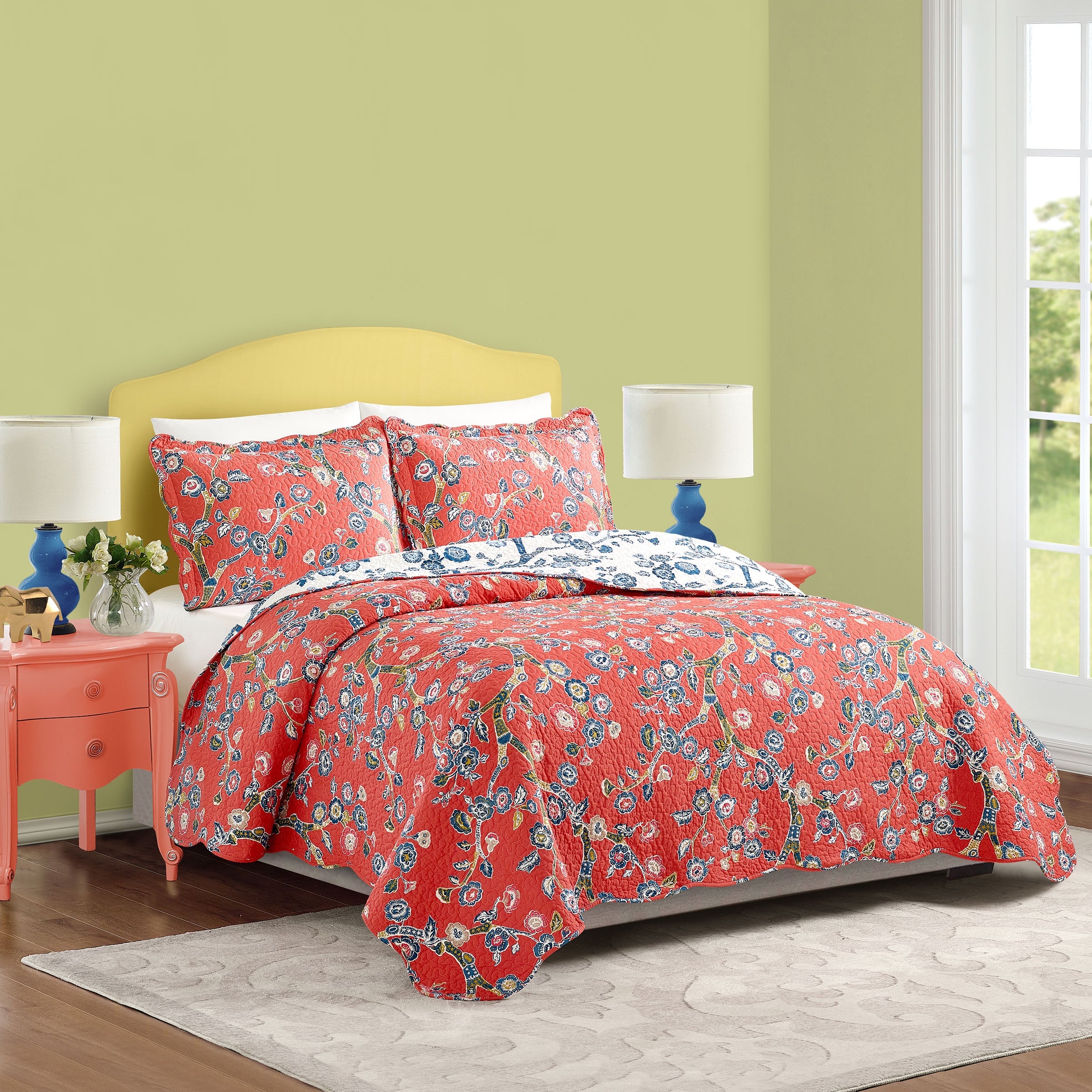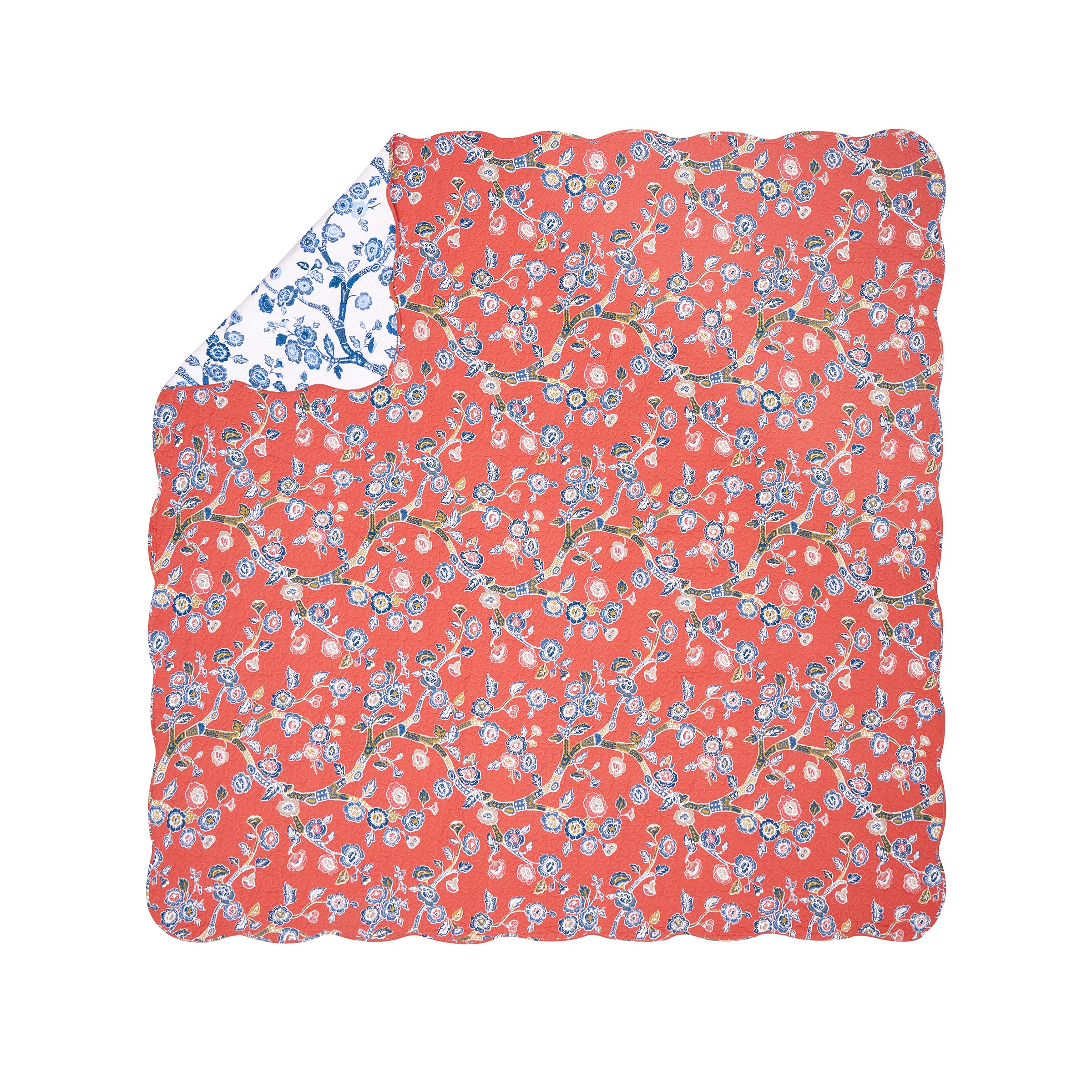 Wake up to happy! The Madcap Cottage Temple Garden 3-piece reversible quilt set with shams boasts glorious designer details such as contrast welting, embroidery and scalloped edges. Our Temple Garden chinoiserie fabric gives your home a taste of the Orient. The rich woodblock-print detailing of cherry blossoms adds an extra layer of dimension and depth. Temple Garden is offered in lacquer red with the reverse featuring an all over blue on a field of white. Take a tired bed and make it tip, top, terrific!