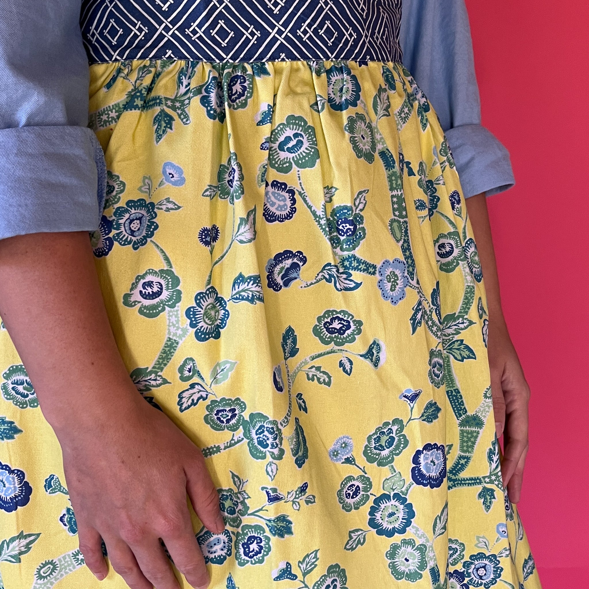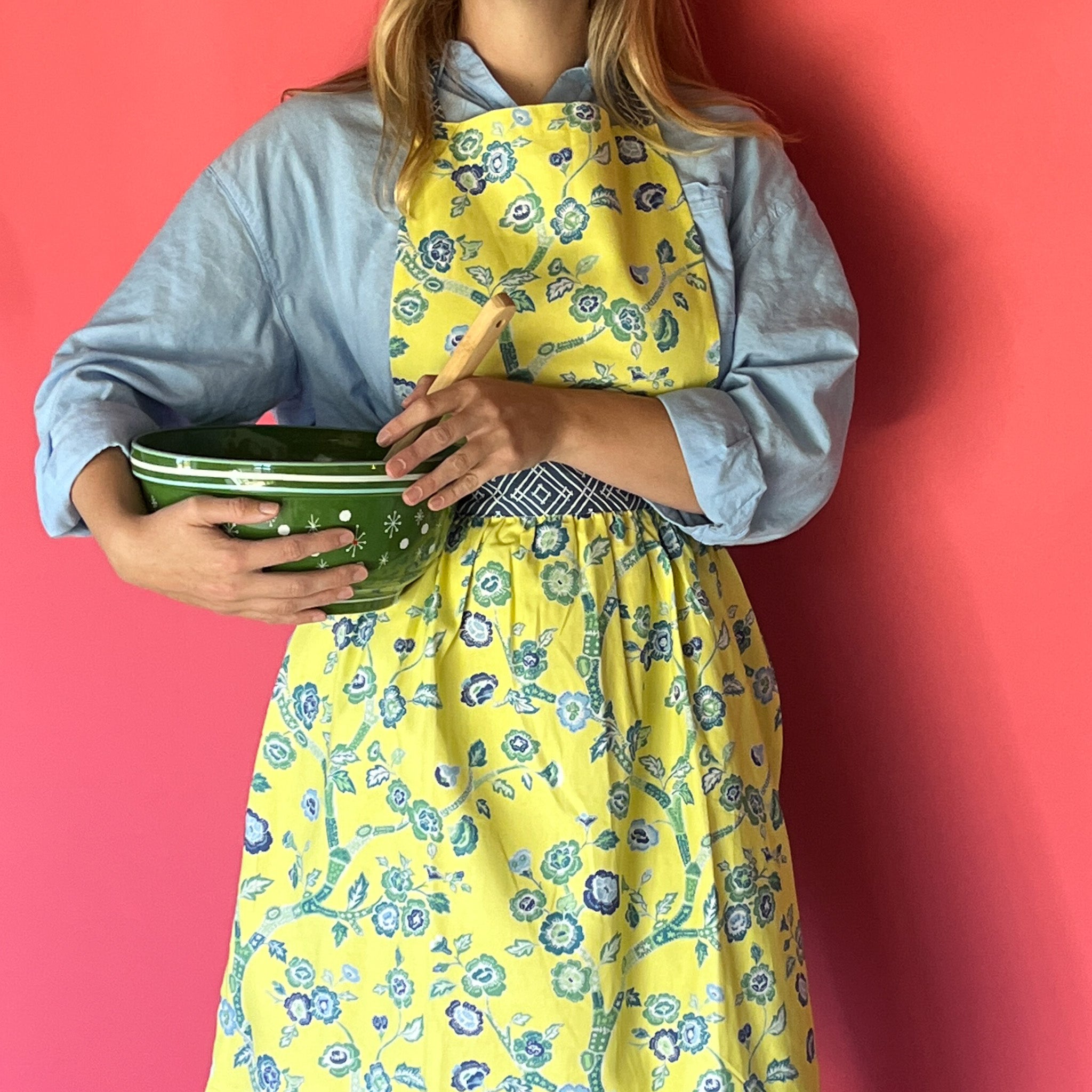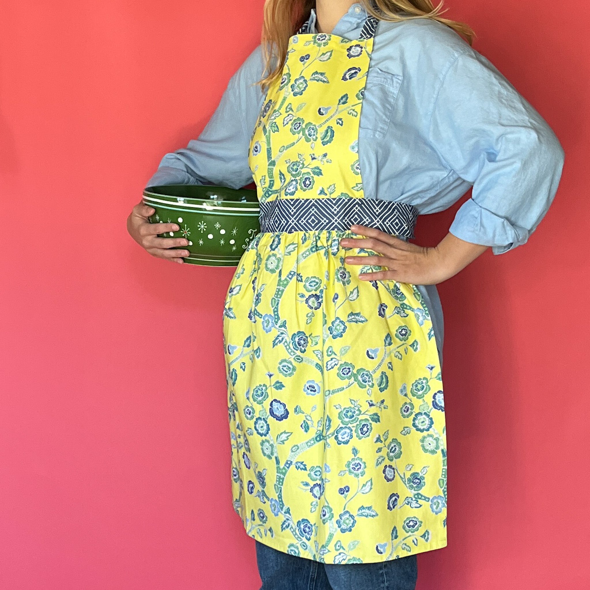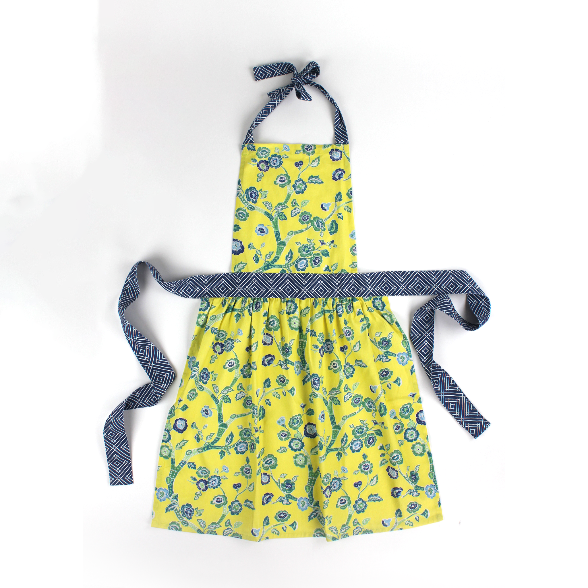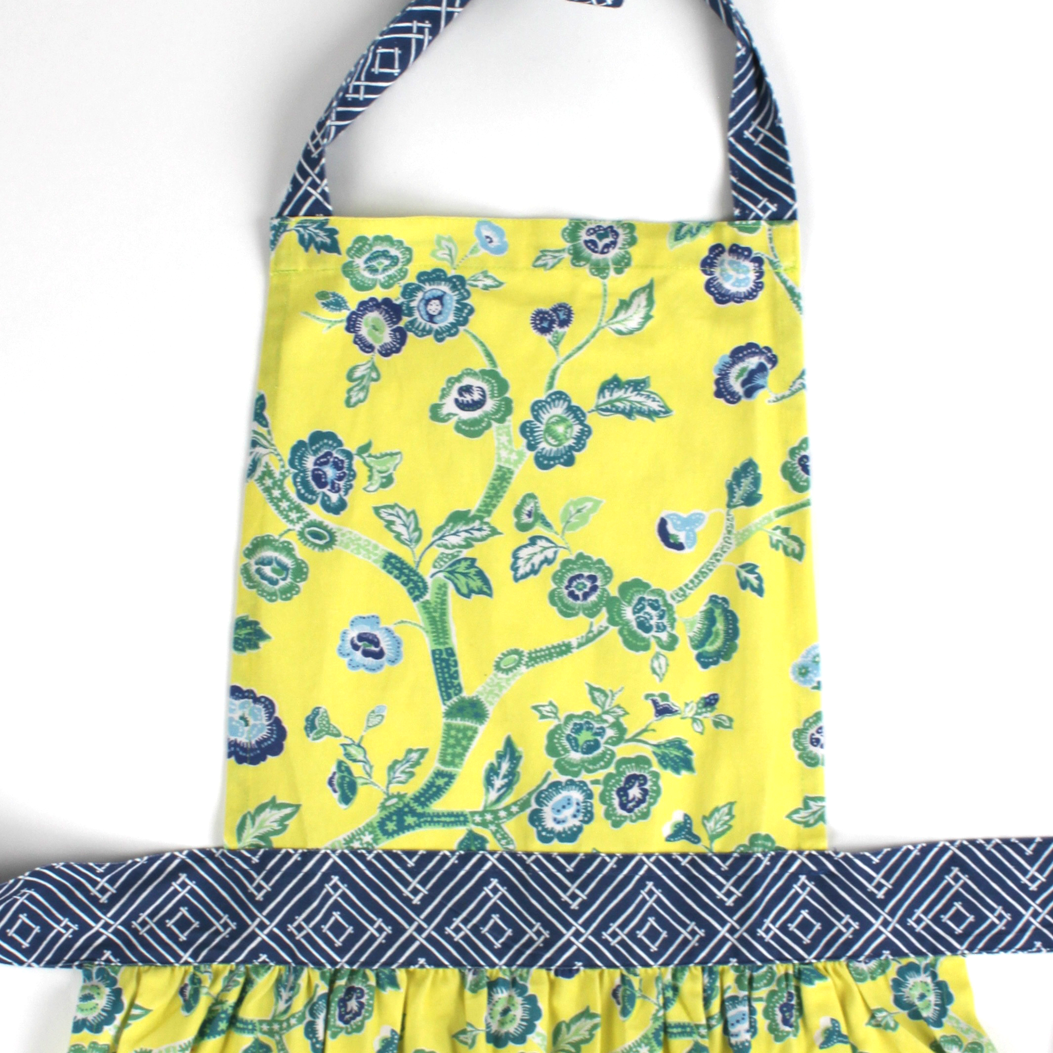 Chinoiserie chic springs to life brilliantly in this peony-rich pattern that will make your kitchen cooking a far-flung adventure in this yellow chinoiserie apron.