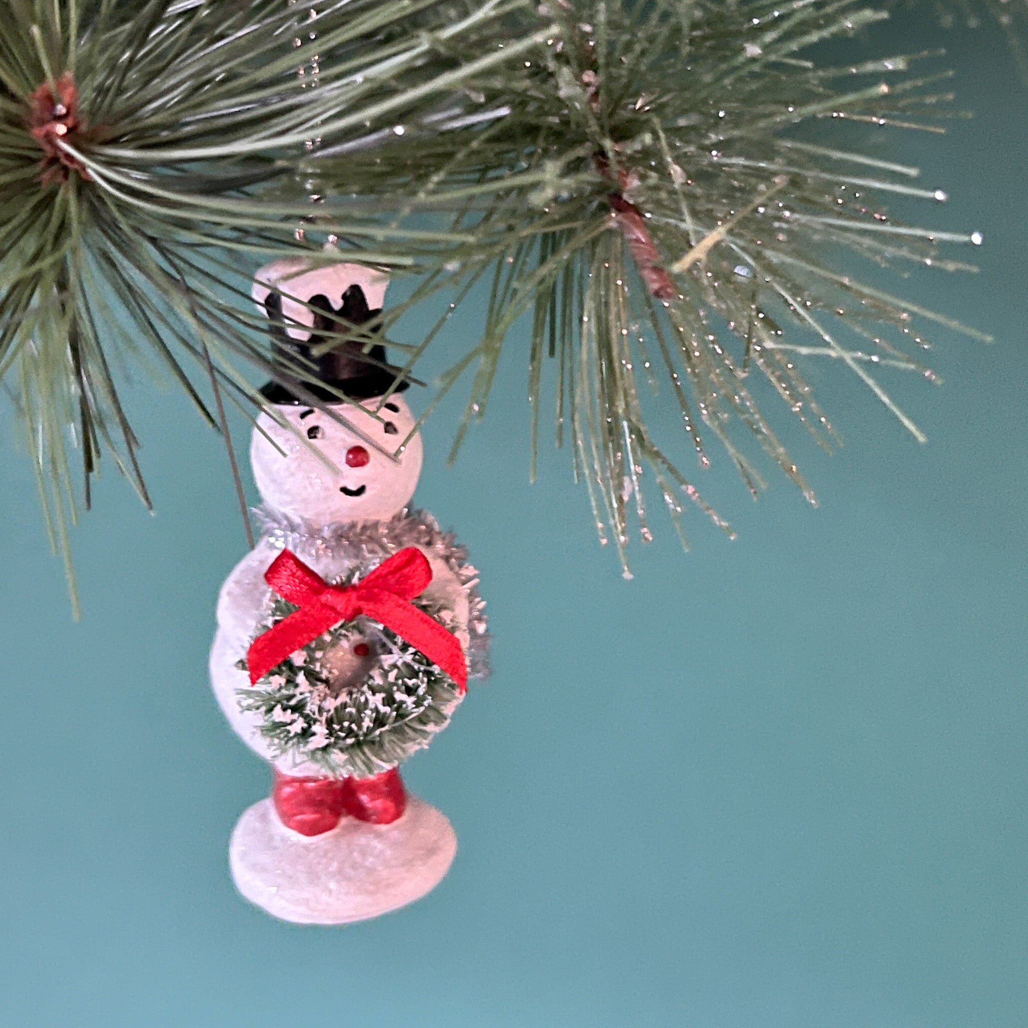 A trio of snowmen in their top hats carries festive holiday cheer in the form of a snow-kissed Christmas tree, wreath, and candy cane. A smile-inducing throwback that will bring some whimsy and fun to your Christmas tree.