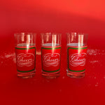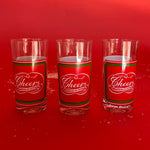 Vintage Tall Red/Green Drinks Glasses, Set of 6. The word Cheers is written in Calligraphy