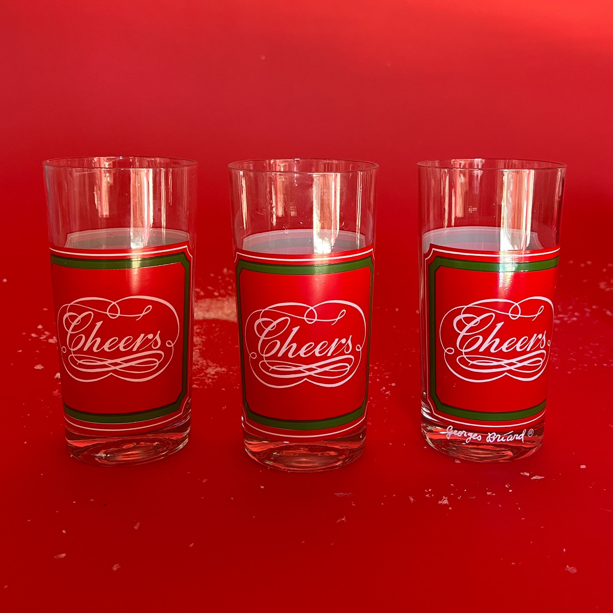 Set up a festive theme this Christmas season with these tall Georges Briard Cheers-emblazoned drinks glasses in red and green that are perfect for serving all of your favorite holiday cocktails.