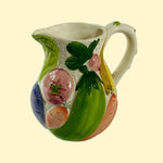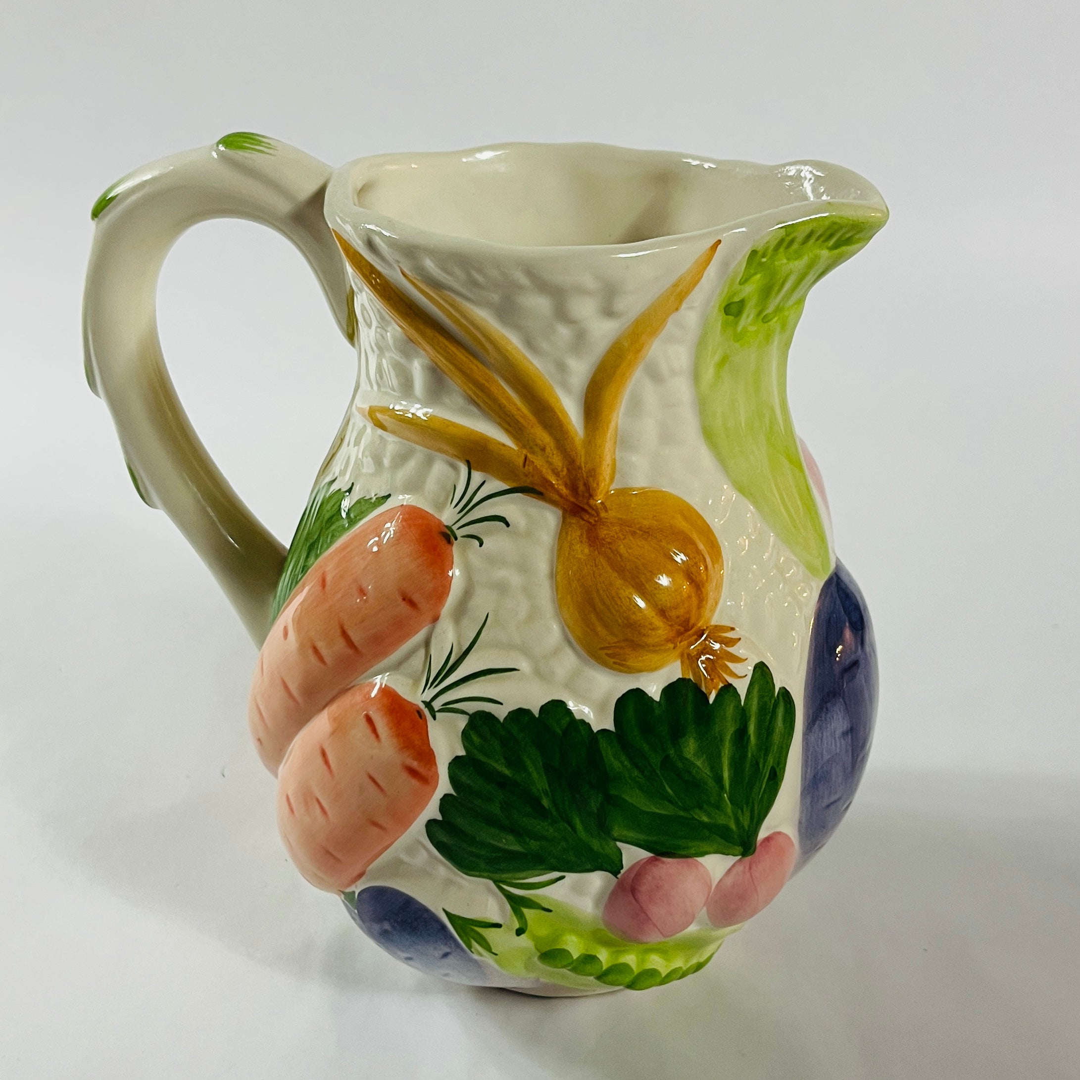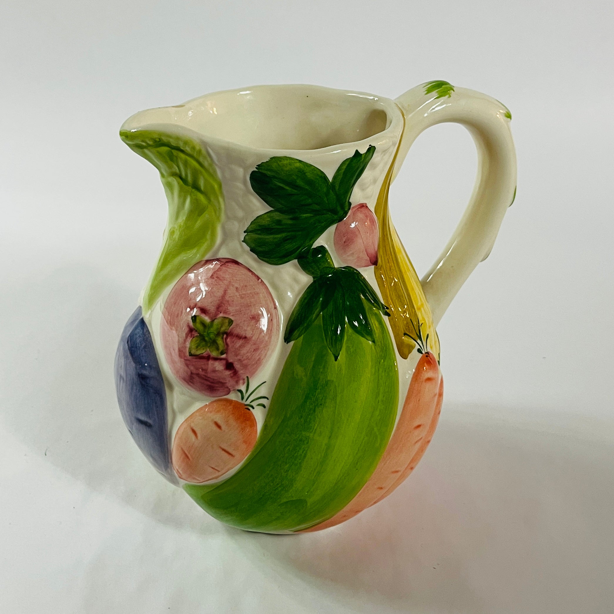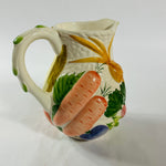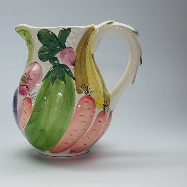 A ceramic pitcher festooned (yes, festooned!) with embossed tomatoes, carrots, radishes and more?! Yes, sign us up. Right this very second. We are "in." And you should be, too!