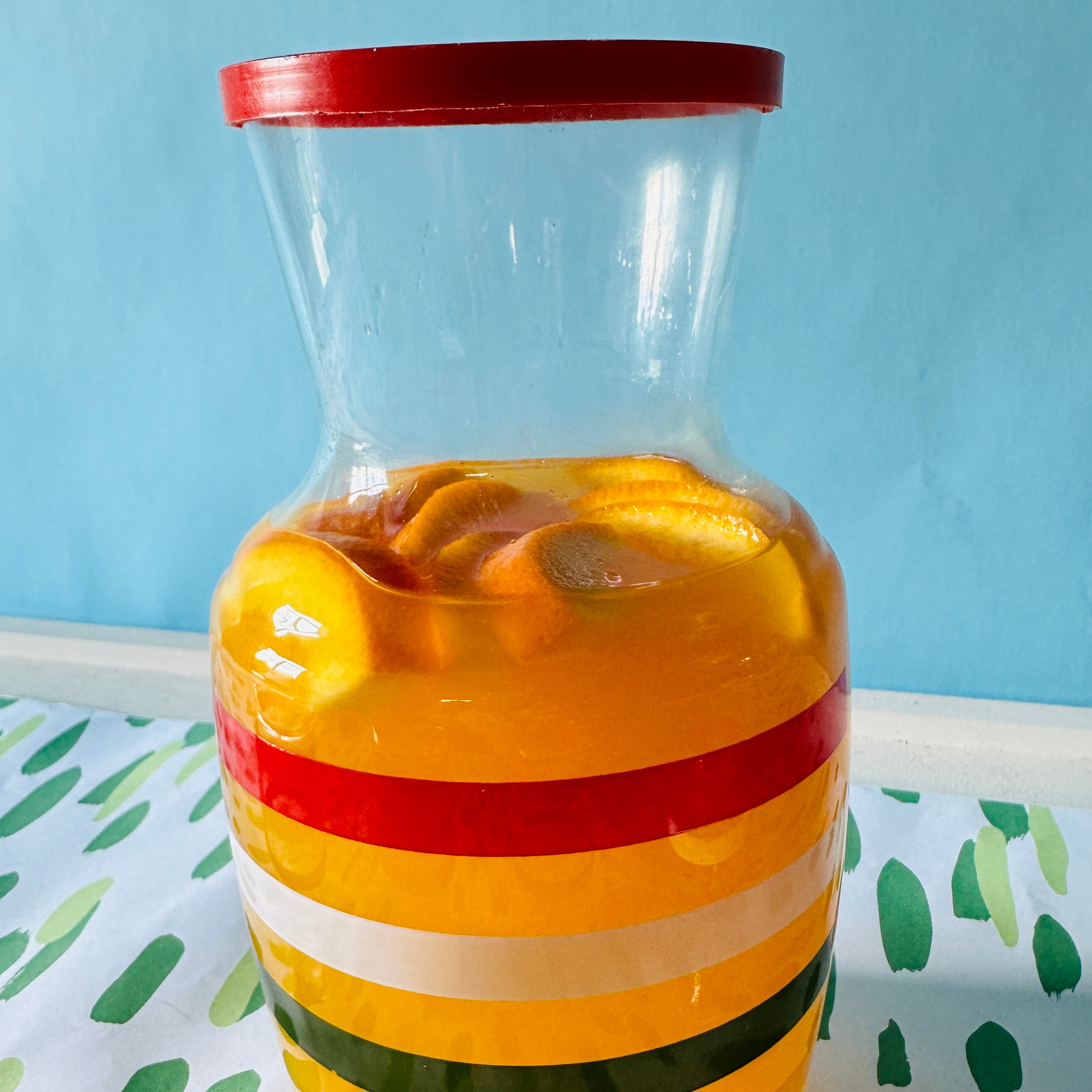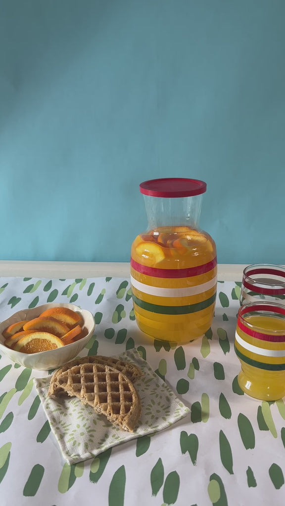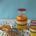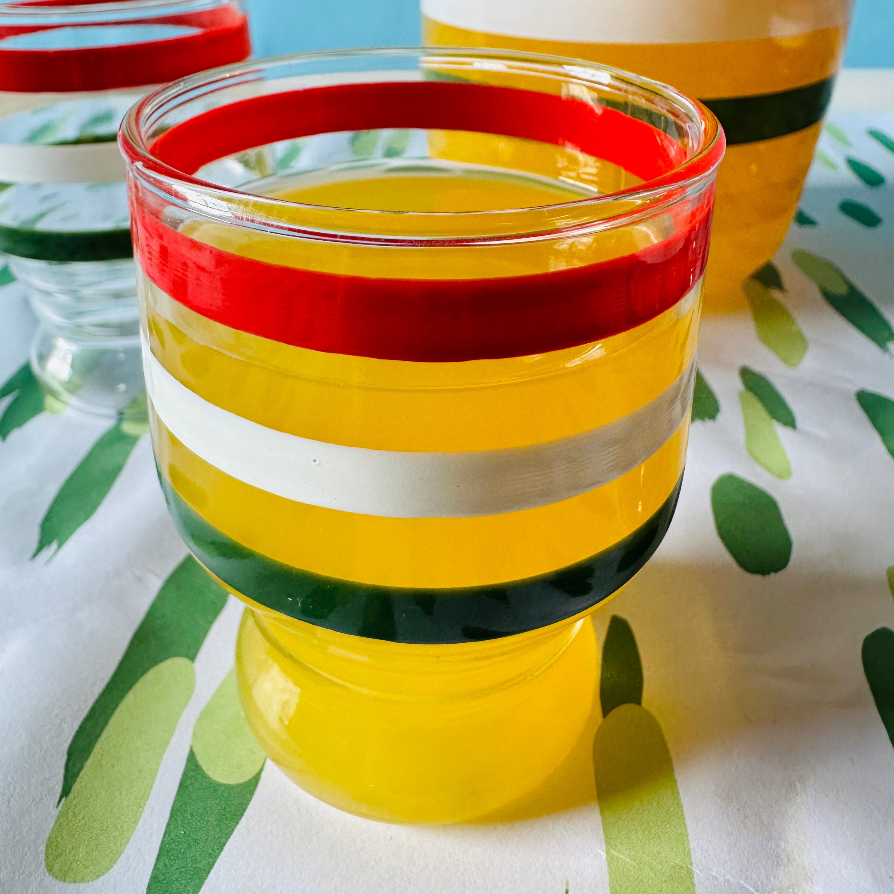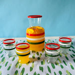 Beautifully colored in red, white, green, and yellow, this carafe is just so deliciously retro chic. Set of four matching glasses. Hand wash.