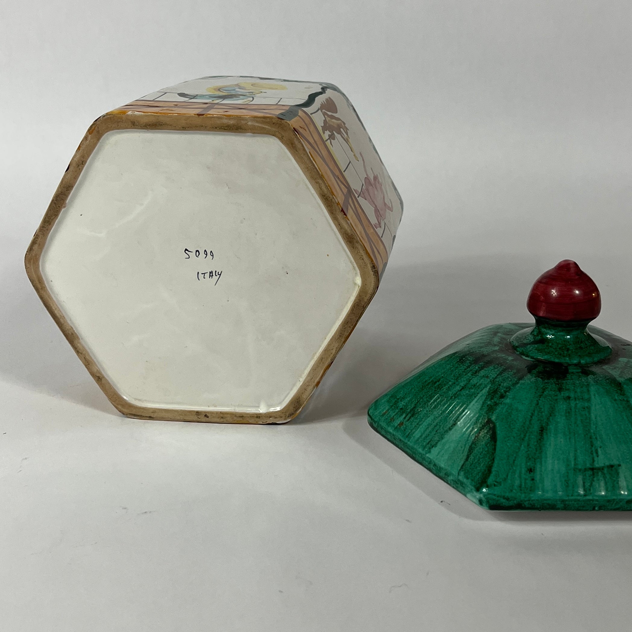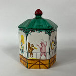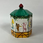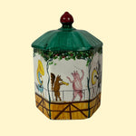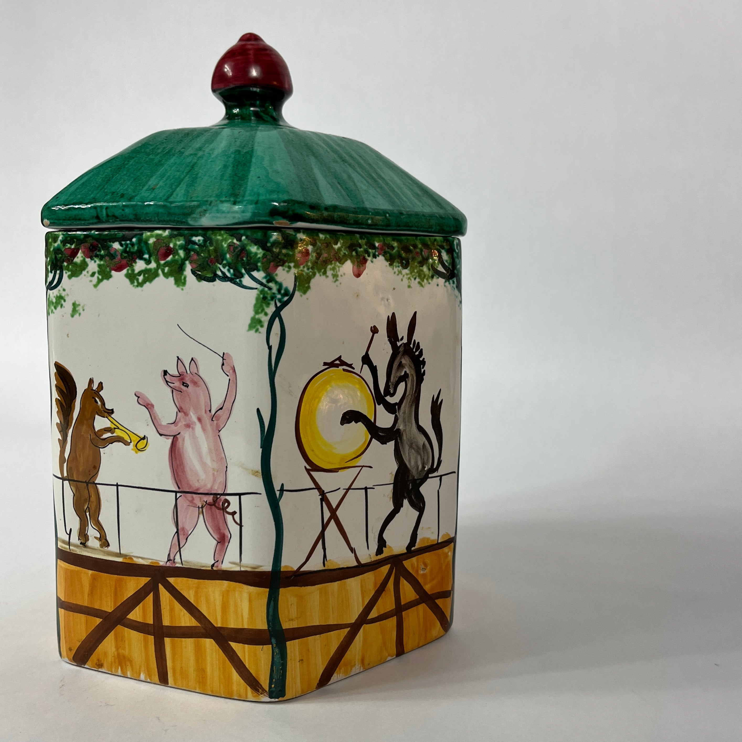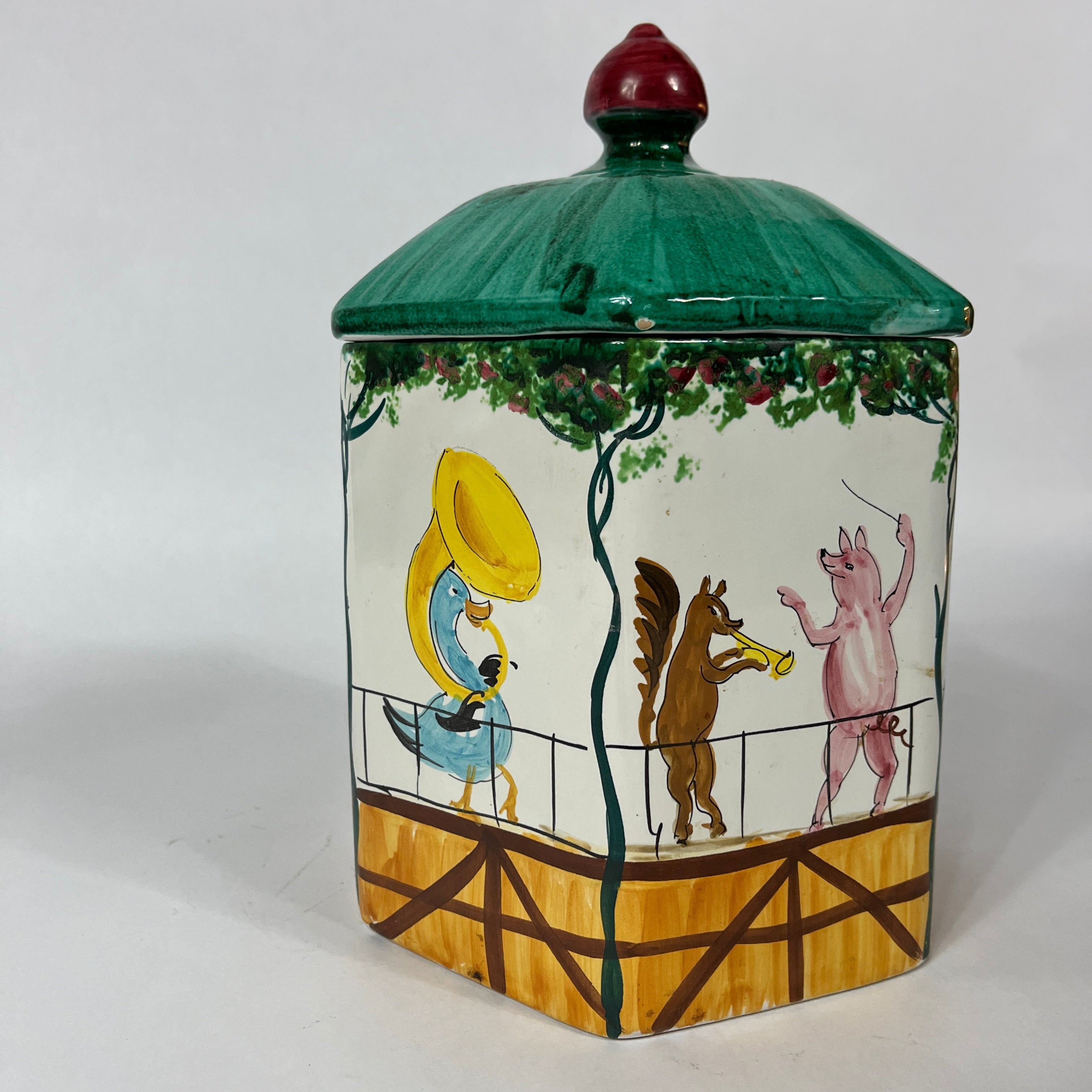 A true work of art in the form of a colorful animal-themed cookie jar imported from Italy. We loved the menagerie of pigs, donkeys, squirrels, and more gaily playing instruments in a bosky bandstand. So much fun!