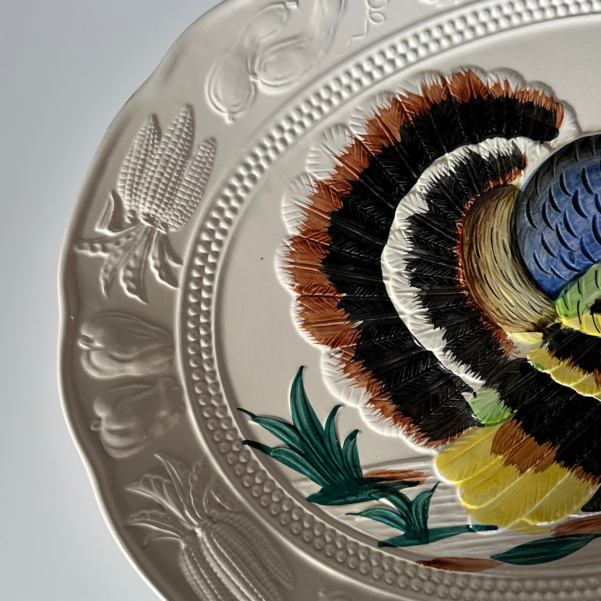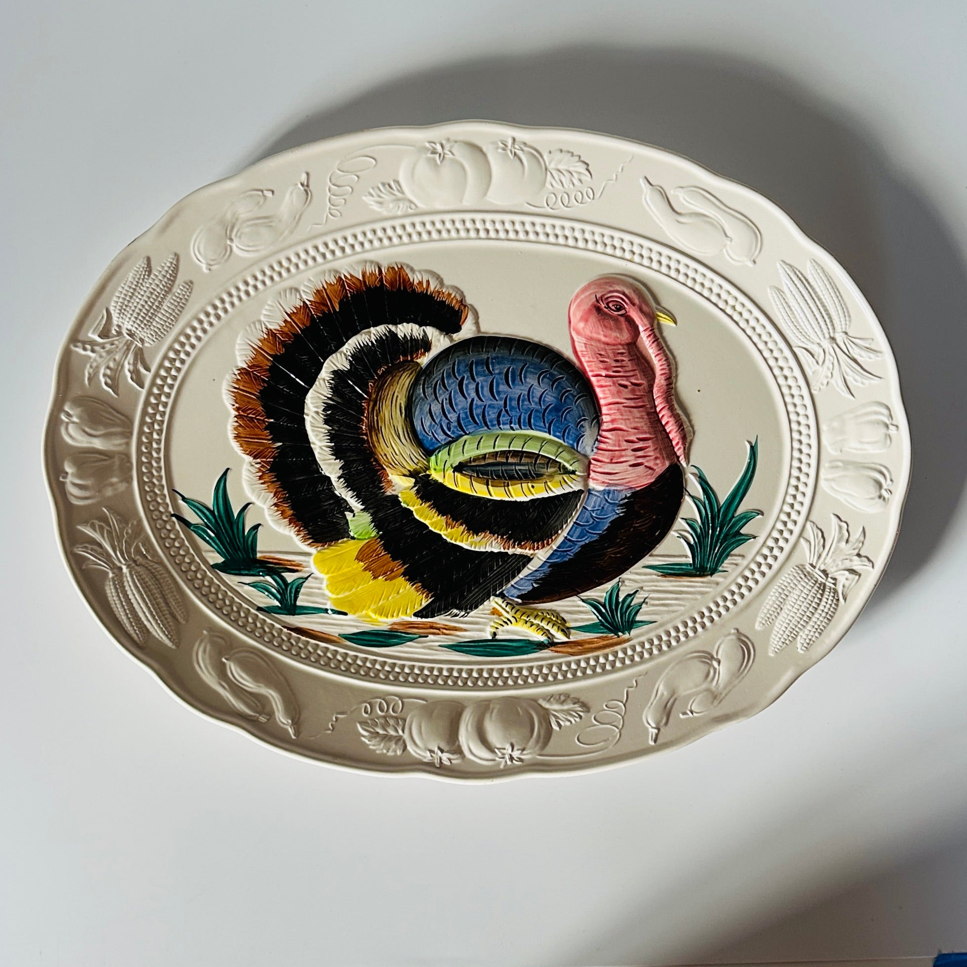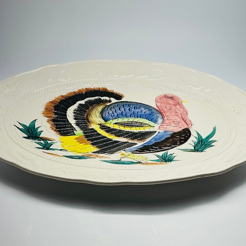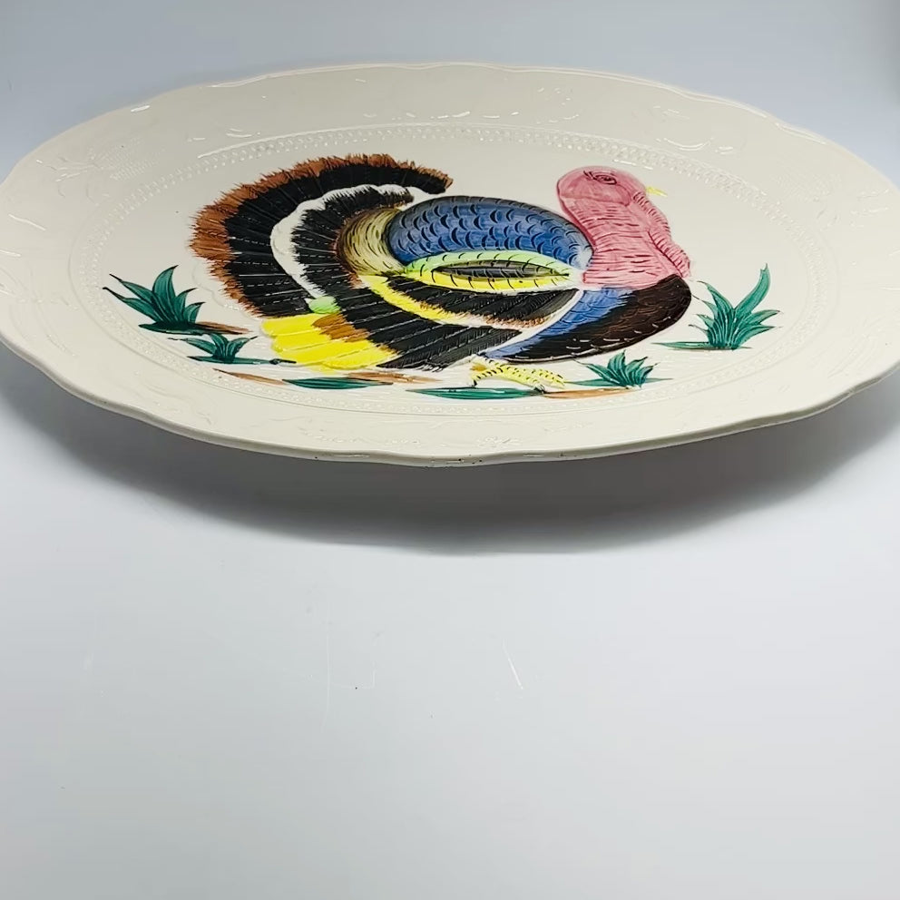 a vintage turkey platter from a side on view