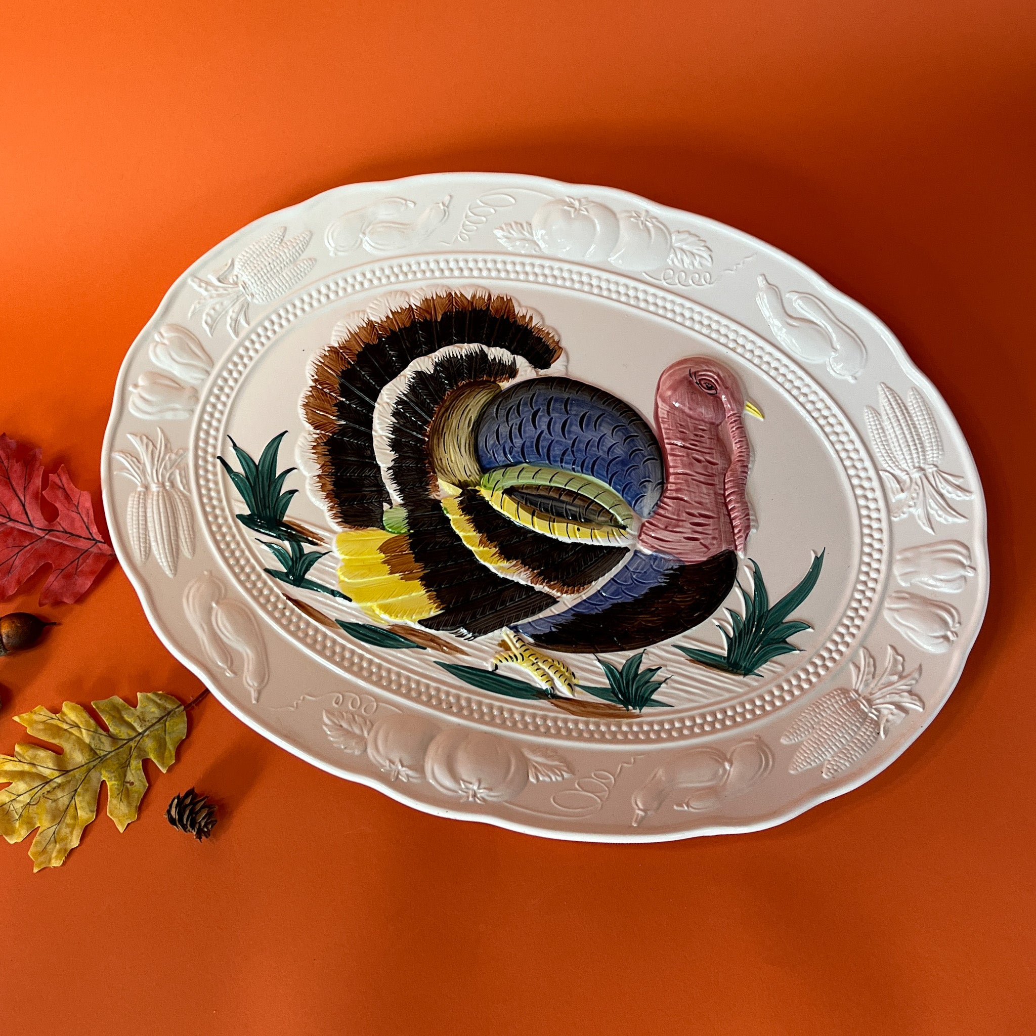 An oversized oval ceramic vintage turkey platter with a vibrantly colored, three-dimensional turkey design in the center, surrounded by a leafy pattern on the rim. The platter is displayed on an orange background with a few autumn leaves scattered around it.