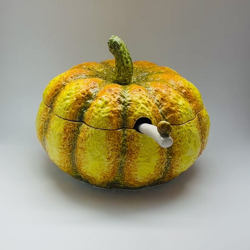 A wonderfully detailed and articulated ceramic pumpkin in perfect-for-fall burnt orange, yellows, and green to serve as the perfect centerpiece for your table. Or use this delight to serve fall soups such as chili and butternut squash. Divine. Plus, the fact that this tureen still has its ladle (whimsically topped with a mini pumpkin).