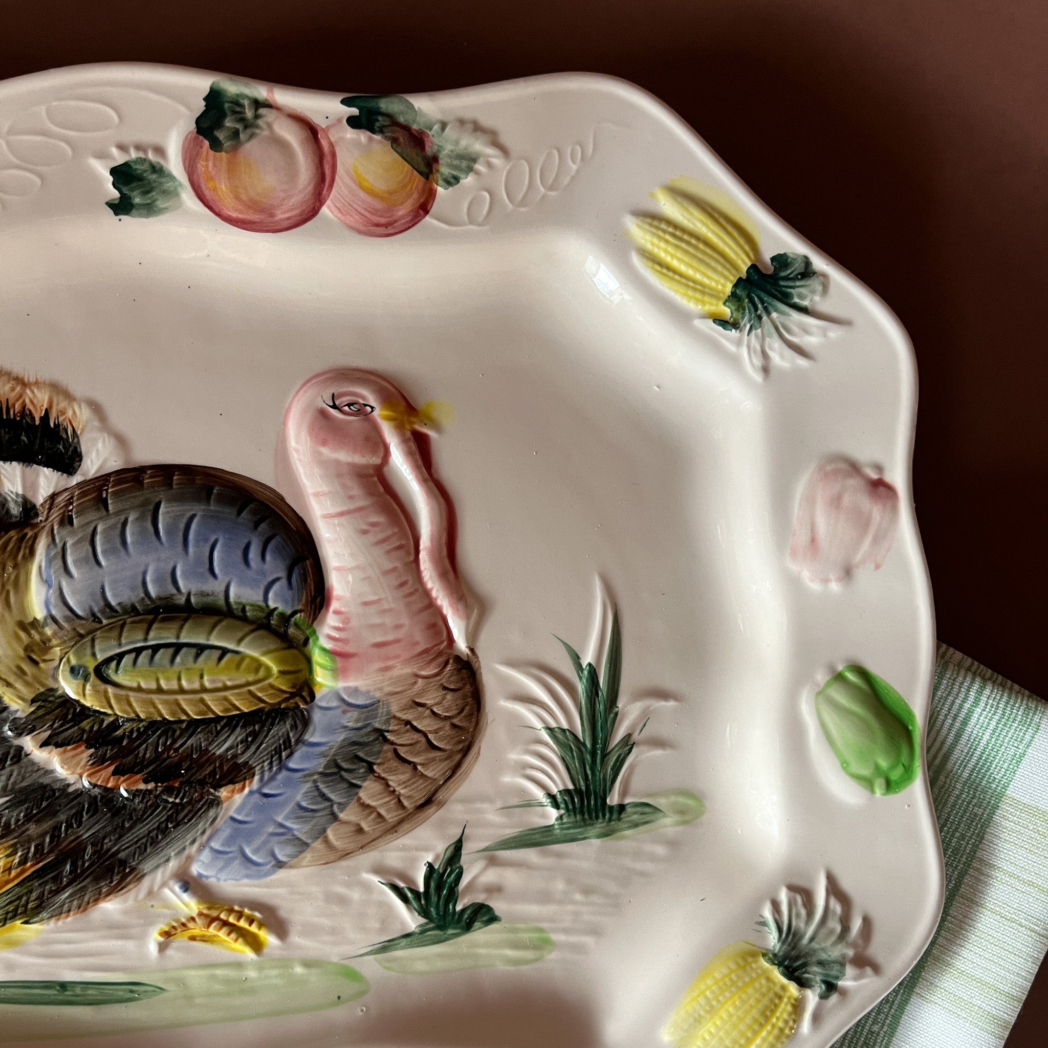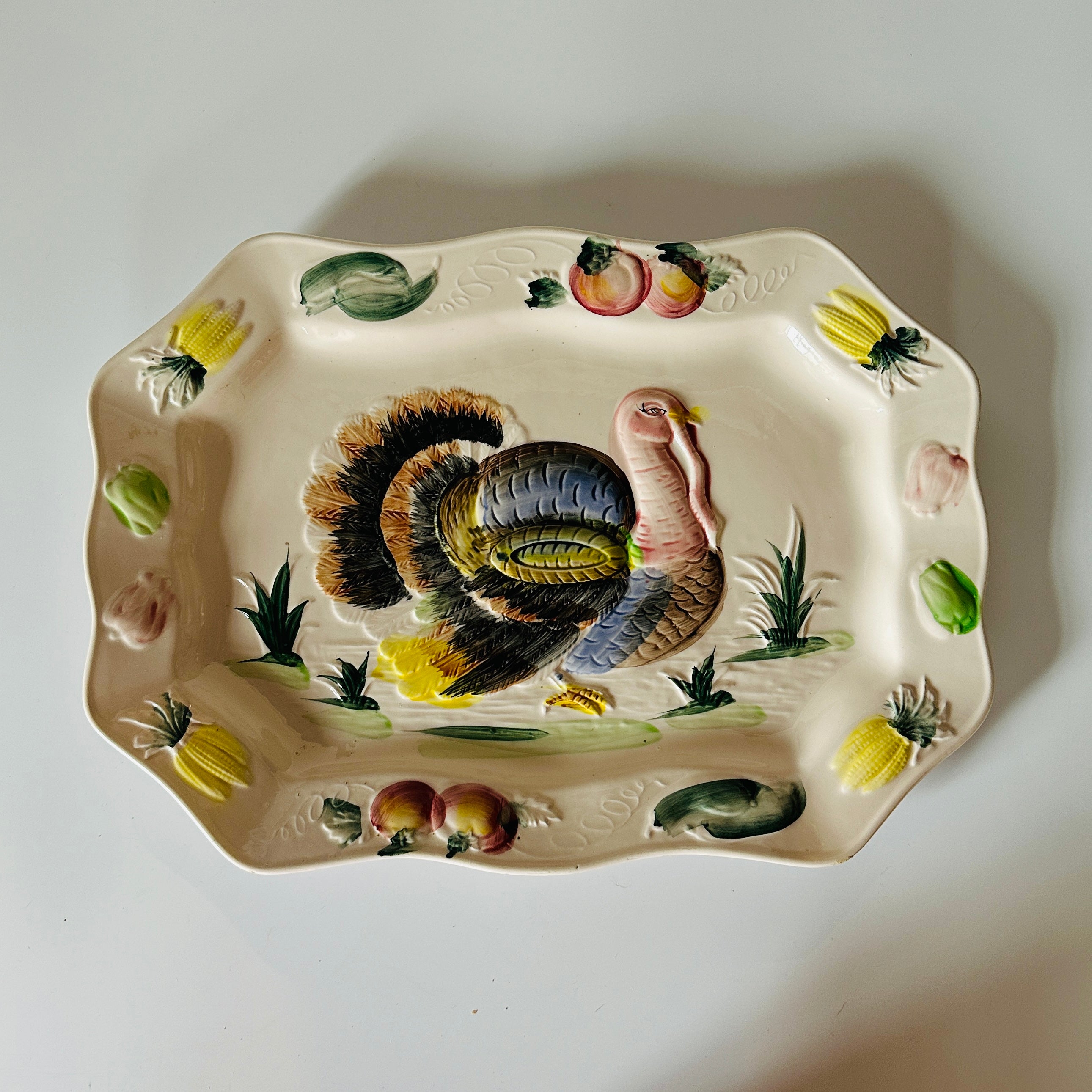 Perfect for serving up a Thanksgiving turkey and all the fixings in style, this oversized vintage turkey platter with scalloped edges has a wonderful three dimensional quality to it and boasts exuberant colors. The perfect gift for the mother-in-law who has everything.
