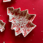 Stunningly splattered with red paint against a snow white background, these three stacking ceramic nut/candy Christmas tree-shaped dishes are the perfect host/hostess gift. We use these splatterware sizzlers to hold keys and other sundries upon the front hall table.