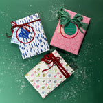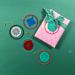 We love how the Mod style Christmas ornament gift tie ons in pink, blue, red and green move within their woven hoops as they dangle from gifts ready to tuck under your tree. Truly unusual and fun!